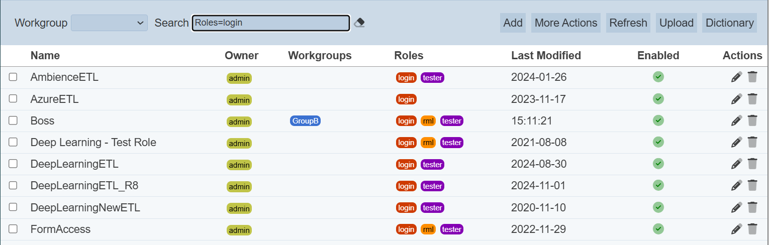 Similarly, deselect the checkbox to disable an enabled chainset. Disabling a chainset also disables using it with the ETL Designer interface for the designated roles. The owner can still access the chainset via the ETL Designer interface. The disabled ETL chainset will be indicated with a red cross under the “Enabled” column in the management page.