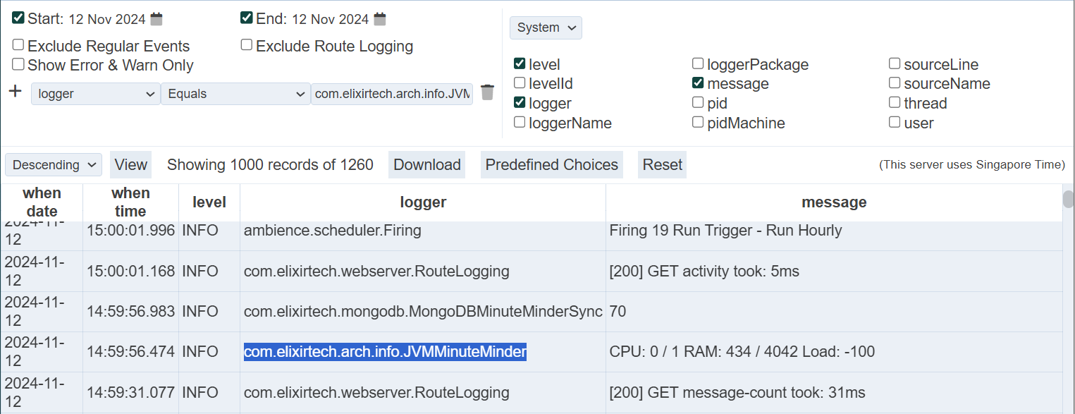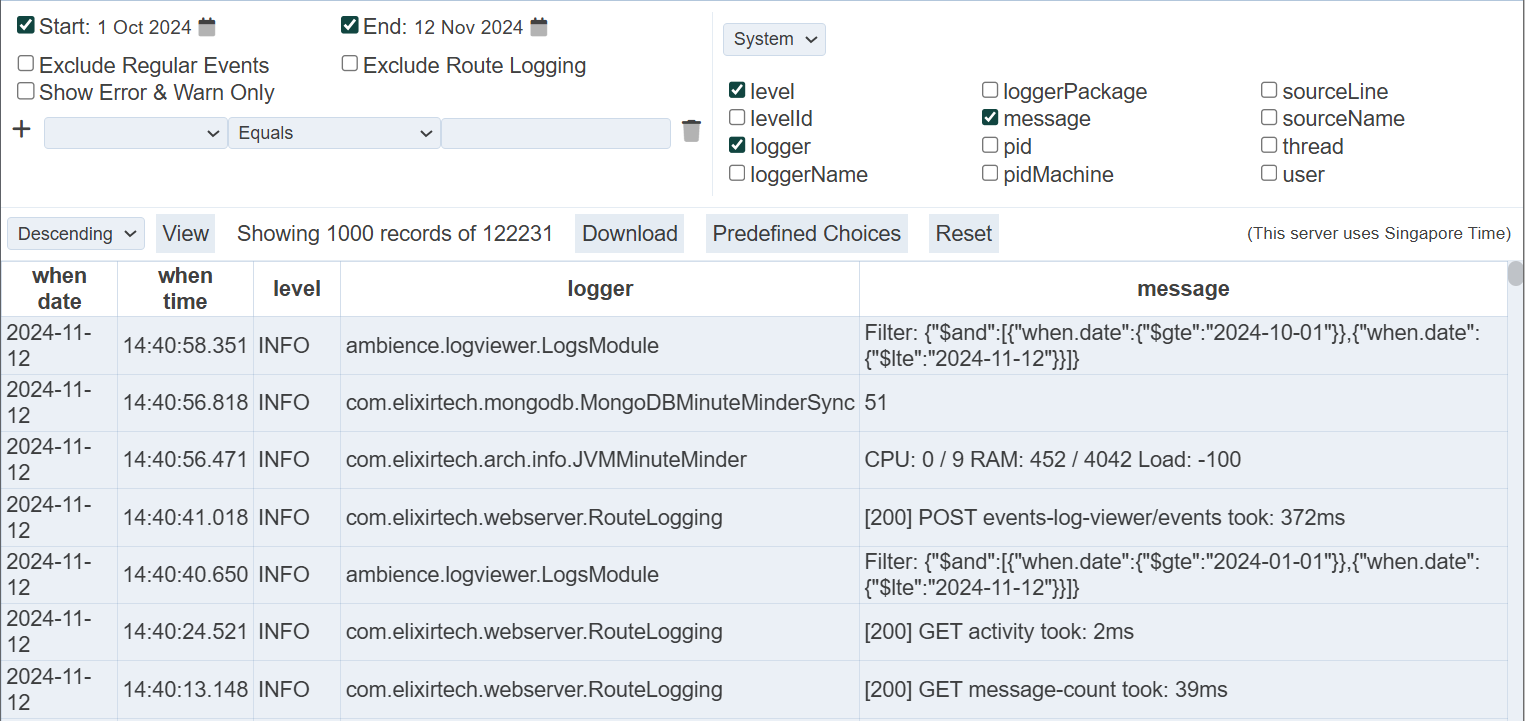 The “Exclude Regular Events” filter allows you to excludes regular events from the log, such as AmbienceAgenda (e.g., hourly scheduled activity) and MinuteMinder (records server statistics every minute).
