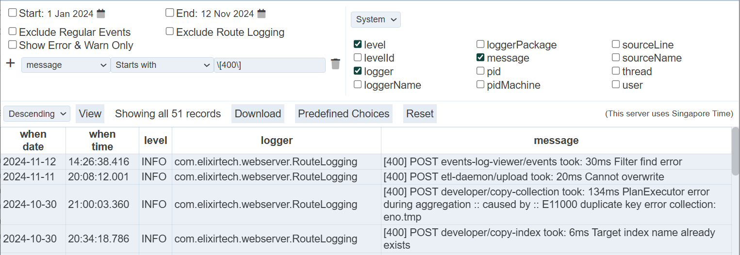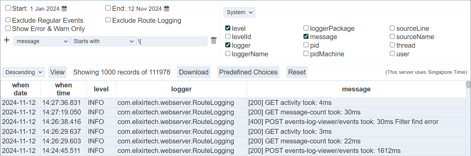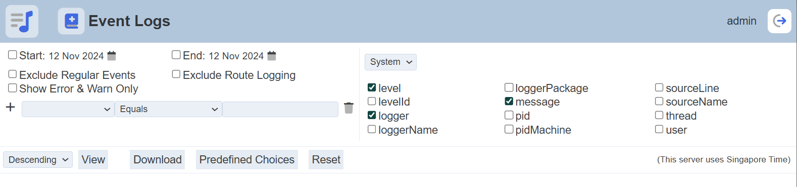 The left panel allows you to select the desired start and end dates, and filters for the log. The right panel allows you to select the desired column fields to be displayed and it consists of two pages; namely “System” and “When”.