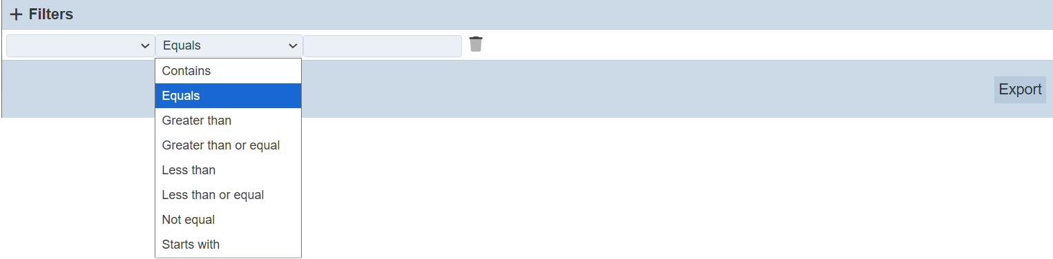 In the first textbox, select the desired field and select the appropriate filter from the drop-down list. Key in the value in the last textbox (case-sensitive). You can add more filters by clicking on the “+” icon at the upper left corner of the section. To remove the filter, click on the