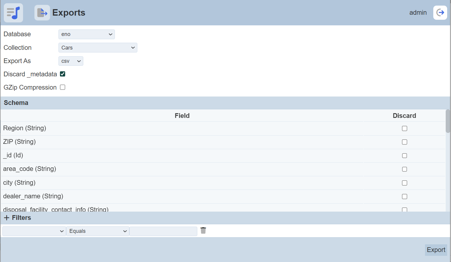To export the data, select the appropriate database from the drop-down list in the “Database” field. In the “Collection” field, select the desired data collection. Select the file format to export in the “Export As” field. By default, the "Discard _metadata“ field is selected, which will remove all ”_metadata“ fields from the output data. If you want to retain the metadata, unselect this field. You can opt to zip and compress the output file by selecting the ”GZip Compression" field.