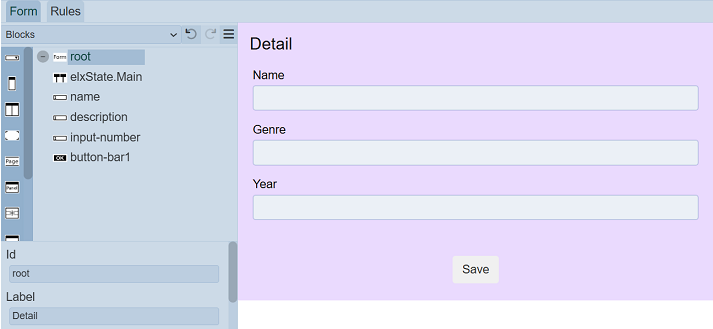 Ensure the “elxState” field uses the value “Main” to align with the Main page in the workflow created earlier. Set up the page as per the screenshot above. The “Save” button is defined as [Save]save so that it will trigger the save transition in the Detail workflow.