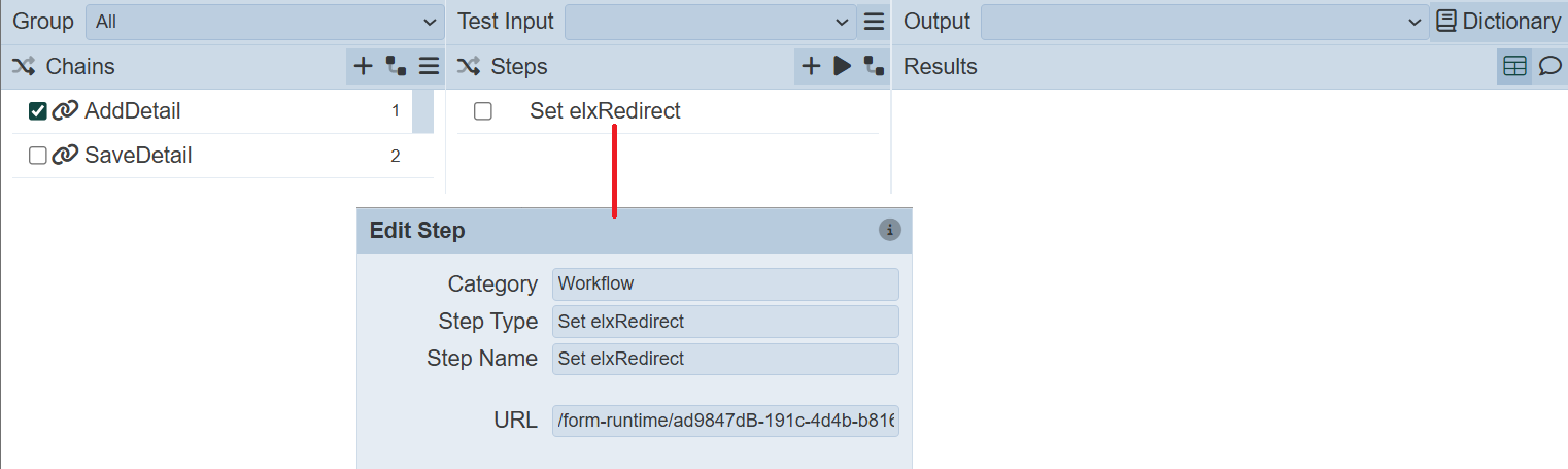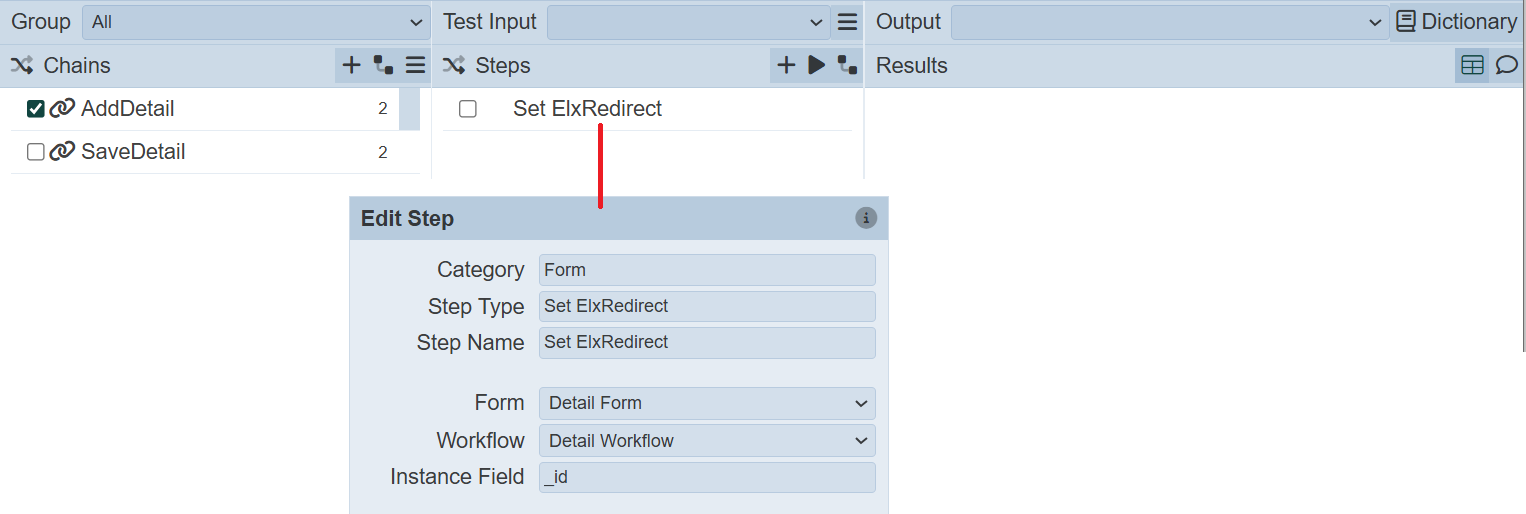 Select AddDetail under the “Chains” column. In this ETL chain, you will add a Set elxRedirect ETL to redirect instruction to the response, causing the form to jump to a different location. There are two such ETLs, one is under the Workflow category, while the other in the Form category. Either one method can be used. In this example, the Set elxRedirect method is used.