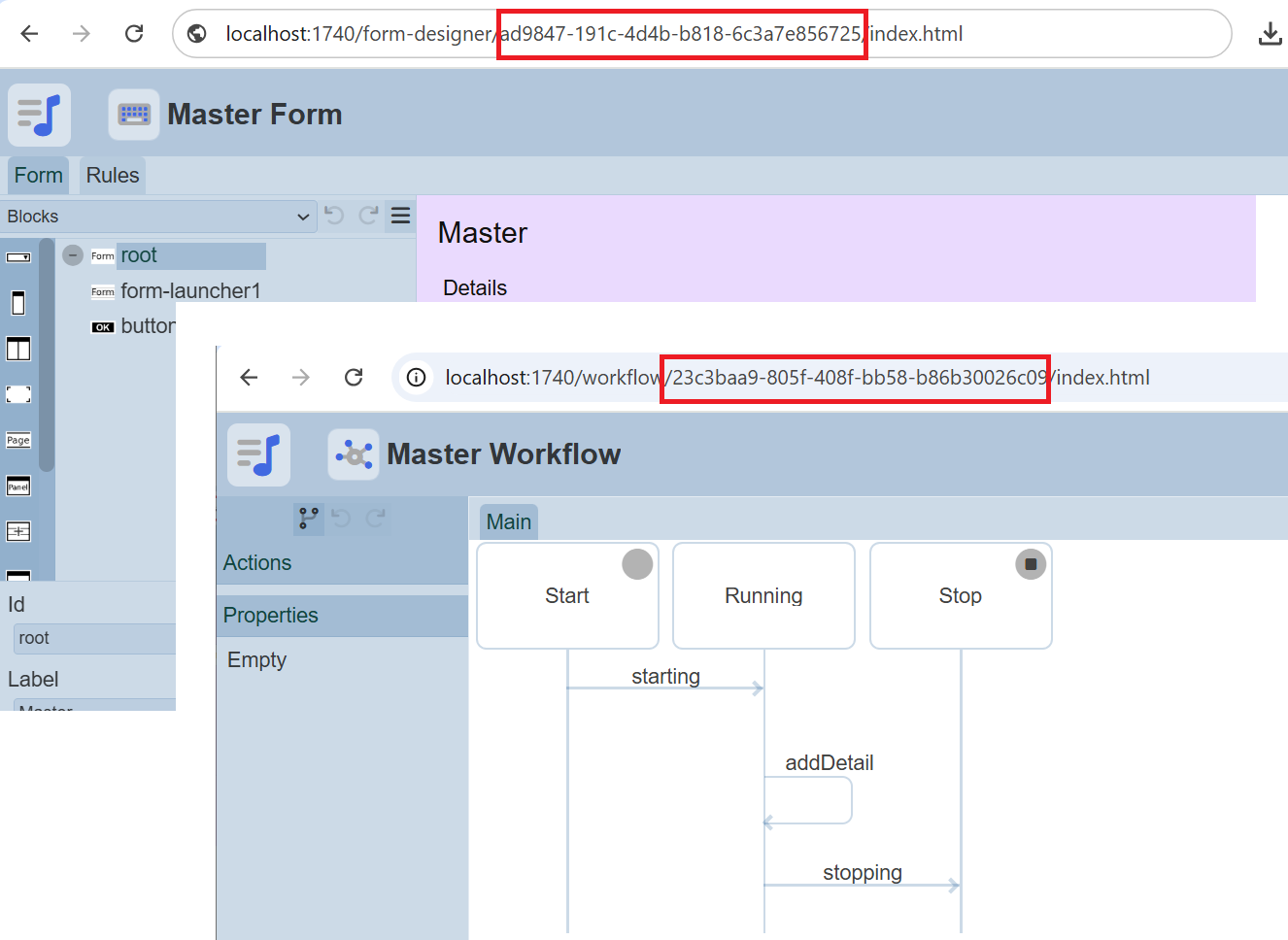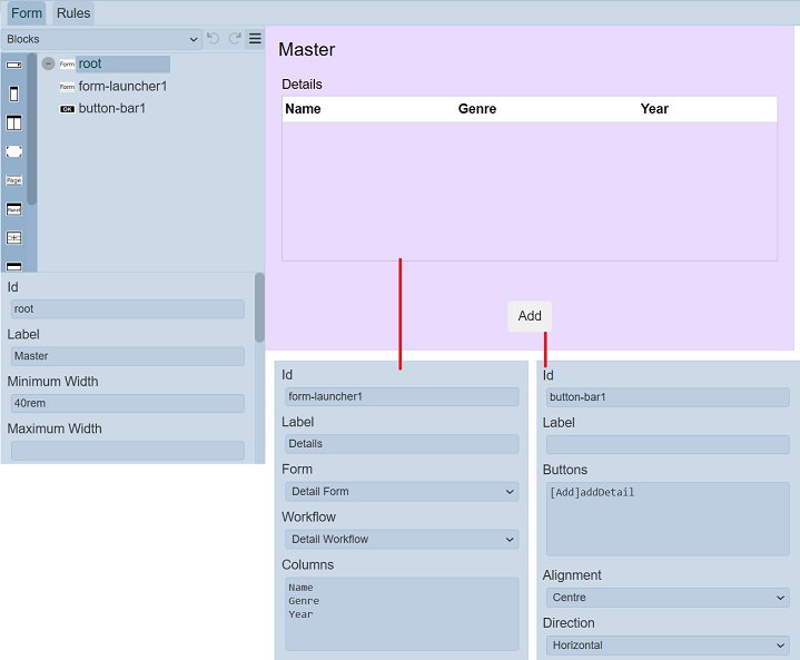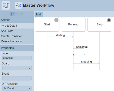 The “Add” button is defined as [Add]addDetail so that it will trigger the addDetail transition in the Detail workflow.