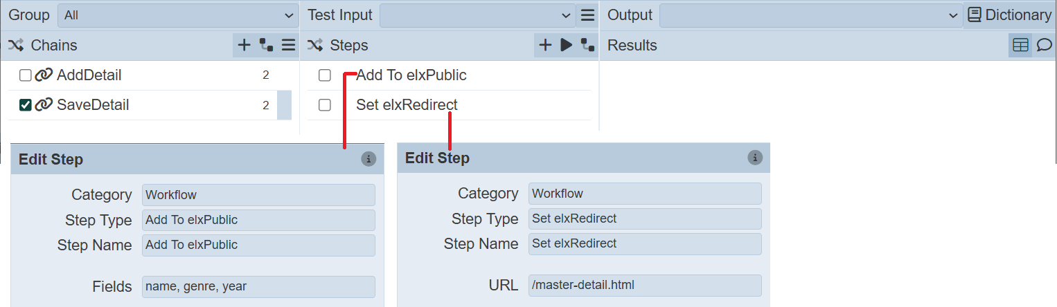 The Add To elxPublic ETL stores the entered data from the form and the Set elxRedirect ETL redirects to the top level master-detail.html link.