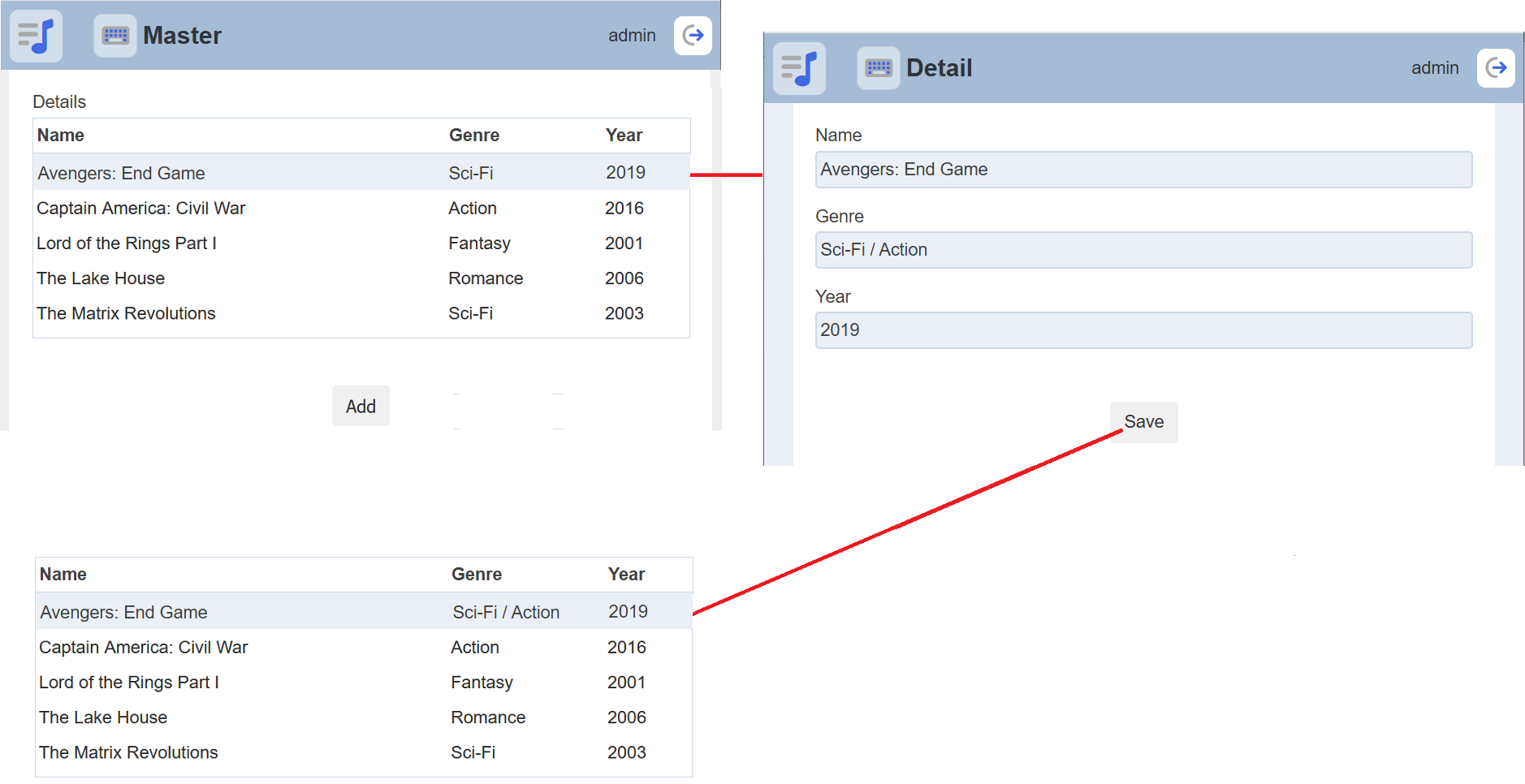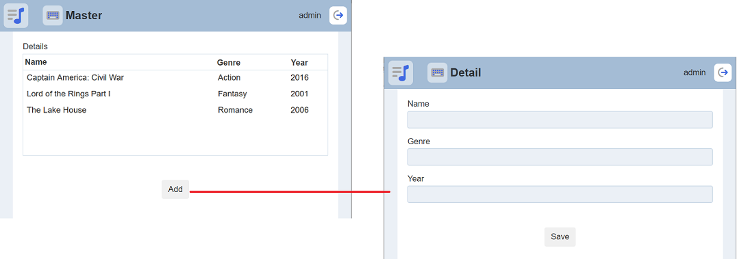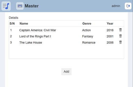 Test this example by visiting the http://localhost:1740/master-detail.html link. Any details added prior will be displayed in the Master form. To add more details, click on the “Add” button in the Master form to launch the Detail form. Add some details and click on the “Save” button.