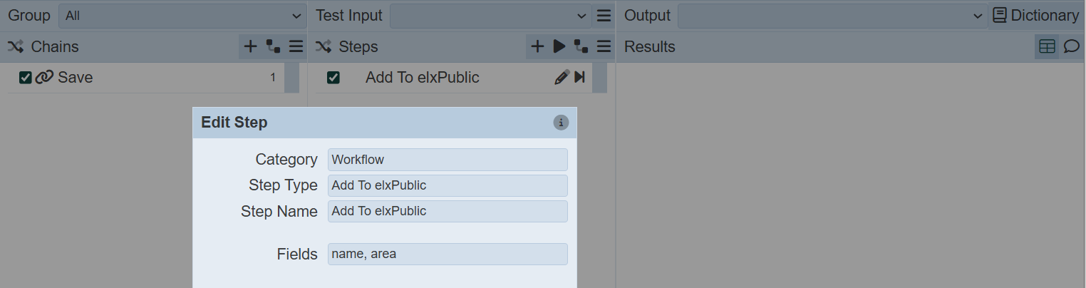 In the “Add To elxPublic” step, key in the fields that need to be made public to pass on the information. In this case, the fields name and area from the form are used.