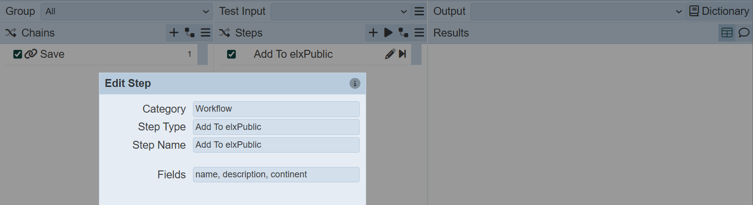 In the ETL module, select “Link-Continent” ETL chainset and add a “Add To elxPublic” ETL step.