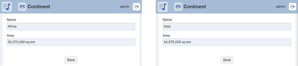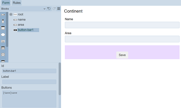 For “Link-Continent” form, add two Text Input components and a Button Bar component. Define the Text Input components as name and area, and the Button Bar component as [Save]save as per the screenshot below.