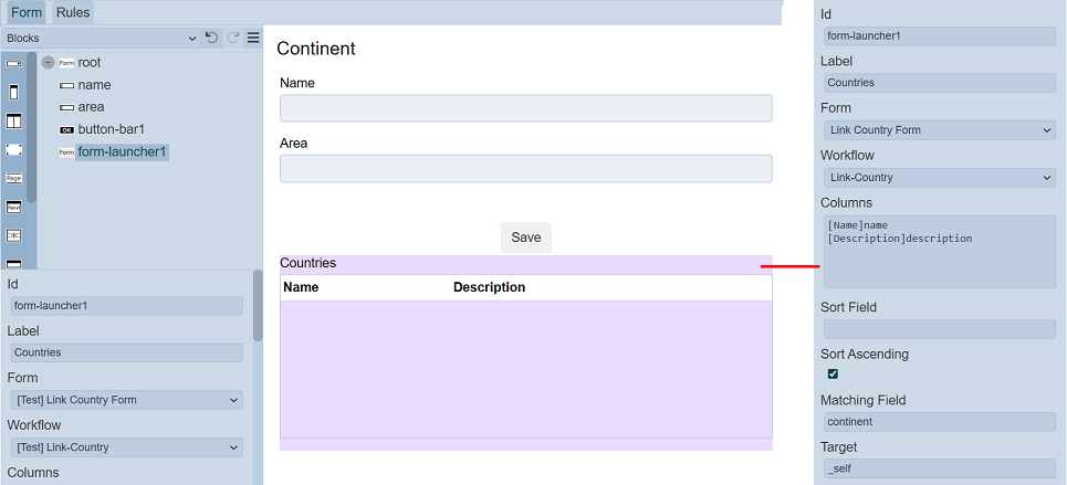 To show a list of countries that belong to each continent, we need to add a Form Launcher component and set the “Matching Field” in its properties.