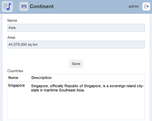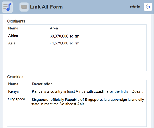 In the “Link-All” form run earlier, click on the “Asia” to launch the form. The “Link-Continent” form shows all countries from the continent Asia, in this case, Singapore is listed.