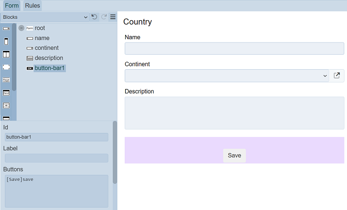 For the “Link-Country” form, add a Text Input, a Form Select, a Text Area and a Button Bar component. Define the Text Input component as name, the Text Area component as continent, and the Button Bar component as [Save]save as per the screenshot below.