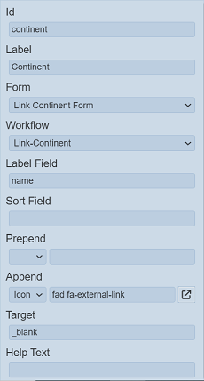 The “Form” and “Workflow” fields defines the form and workflow to be used. The “Label Field” defines the continent name to be used as options from the form selected prior. An icon is added at the end to enable jumping between forms. In this case the target is set to open on a new tab.