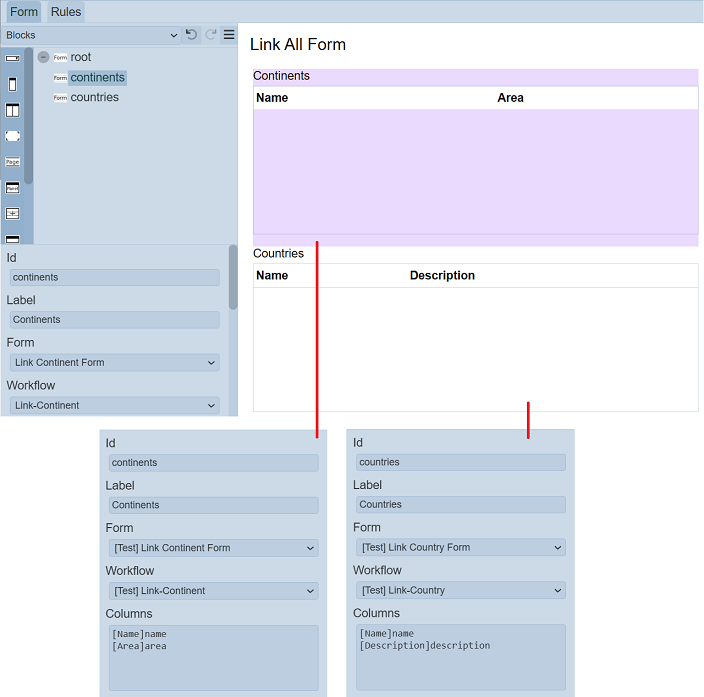 In the Forms module, create two forms, namely “Link-Continent” and “Link-Country”.