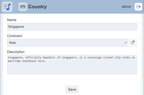 Run the “Link-Country” form. Fill in the details for the “Name” and “Description” fields as per the screenshot below. Click on the “Continent” field and a drop-down list will appear. The options in the list are from the “Link-Continent” forms that are entered earlier. Select “Asia” in “Continent” field.