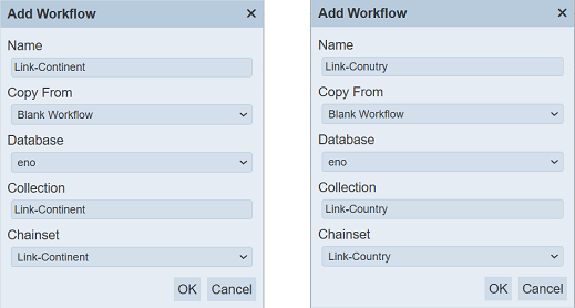 In the ETL module, create two ETL chainsets, namely “Link-Continent” and “Link-Country”. Leave the ETLs blank at the moment.