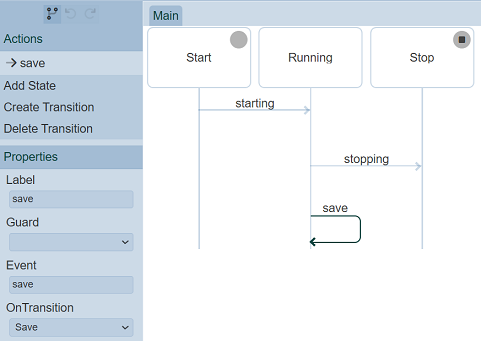 In the Workflows module, select the “Link-Continent” workflow and add a new transition save that loop to the same “Running” state. In the “OnTransition” field, select “Save”. This transition will be called by the [Save]save on the form.