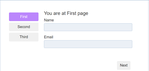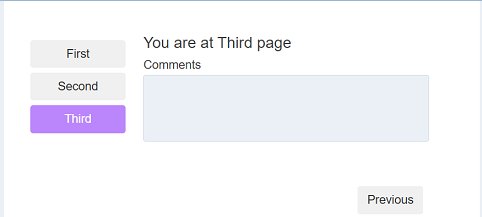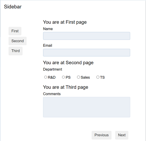 Run the form with the workflow created above. The form will display the sidebar on the left, highlighting the “First” button and “Page1” on the right.