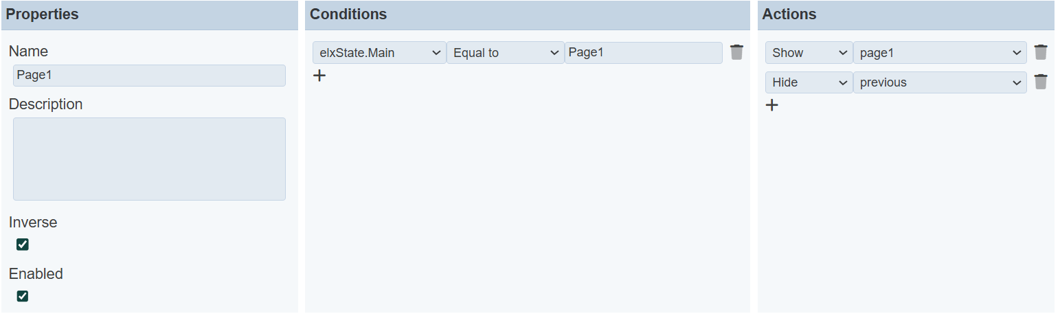 Note that the “Inverse” field is selected. Setup the “Actions” panel to show only Page 1 and hides the “Previous” button when the workflow state is “Page1”.