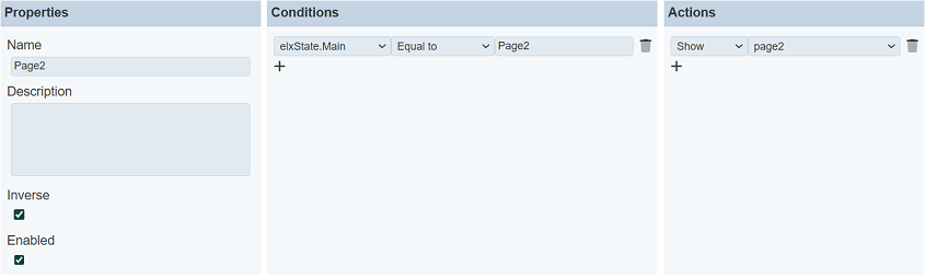 Note that the “Inverse” field is selected. Setup the “Actions” panel to show only Page 2 when the workflow state is “Page 2”.