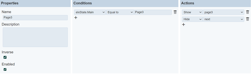 Note that the “Inverse” field is selected. The setup in the “Actions” panel shows Page 3 and hides the “Next” button when the workflow state is “Page3”.
