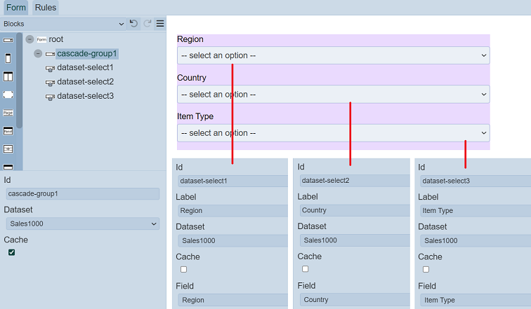| Cache | If selected, loads the set of data once when the form loads. If unselected, loads the data from the server any time a select is changed. |