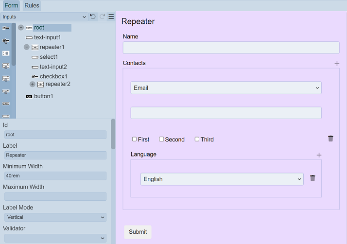 The Repeater component allows you to add a space where other components can be added within it and allow the component itself to be duplicated again. It has the following properties.