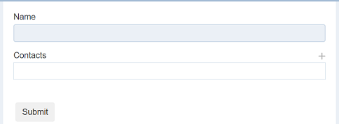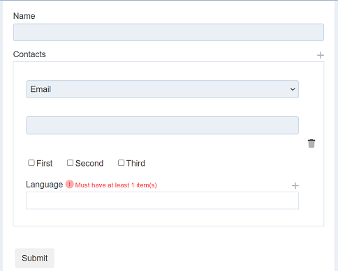 Run the form and click on the “+” icon on the right of the “Contacts” section. Without selecting any language, click on the “Submit” button. An error message will appear.