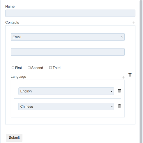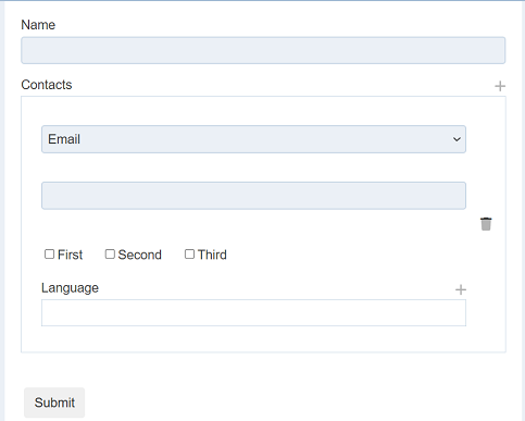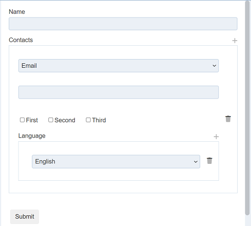 The first Repeater component is the “Contacts” section and the second Repeater component is the “Language” section. To add a contact, click on the “+” icon on the right of the “Contacts” section. The “Contacts” section will expand and display the components within it. To add more contacts, click on the “+” icon and the Repeater component will duplicate itself and display in the form.