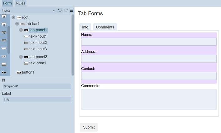 The Tab Panel component along with the Tab Bar component, allows you to create form with multiple tabs. The Tab Panel components are to be added under the Tab Bar component.