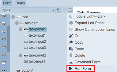 The two labels will appear in the Tab Bar (tab-bar). This will allow you to switch between the two tabs. Add the Input components into the two Tab Panel components and the Action component onto the root. Do note that the Input components will appear in the right panel of the Form Designer according to the sequence they are added into the form structure.