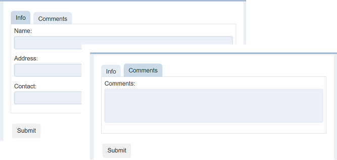 In this example, a form is created with three tabs and a submit button. Each tab requires the user to enter or select the desired value in the field. If the value entered is not valid, an error message will appear in the form in red.