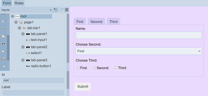 Create a form with the following components under the root. The Tab Bar component (tab-bar1) is first added to the root, which places a placeholder to display the labels of the subsequent Tab Panel components that are added.