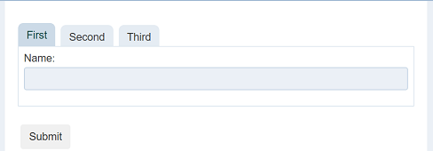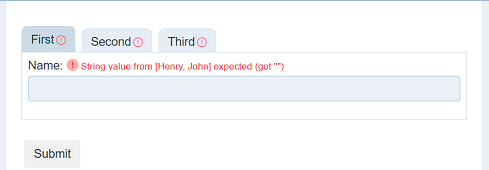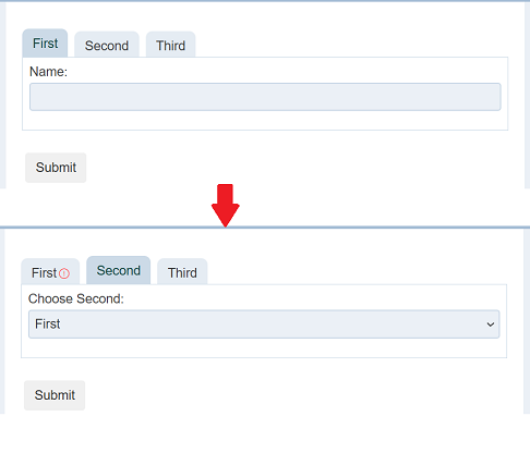 In the “First” tab, do not enter anything into the “Name” field, simply click the “Submit” button. A red exclamation mark will appear in the tab and an error message will appear in red next to the field.