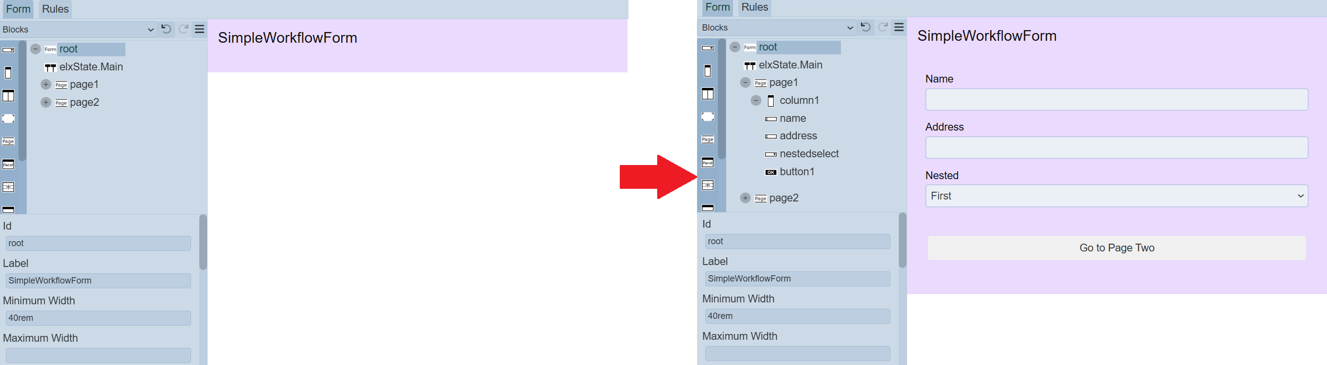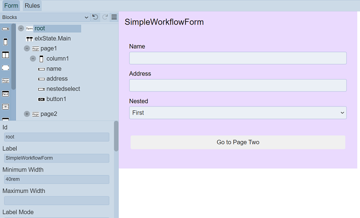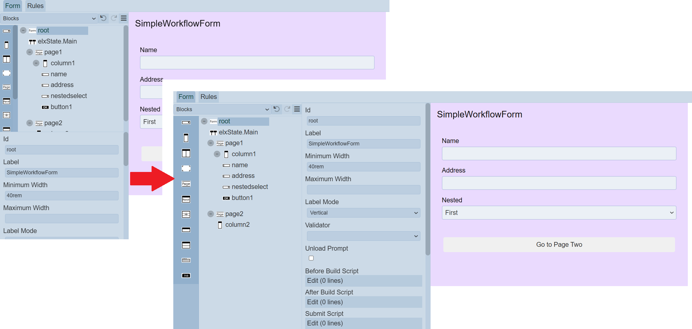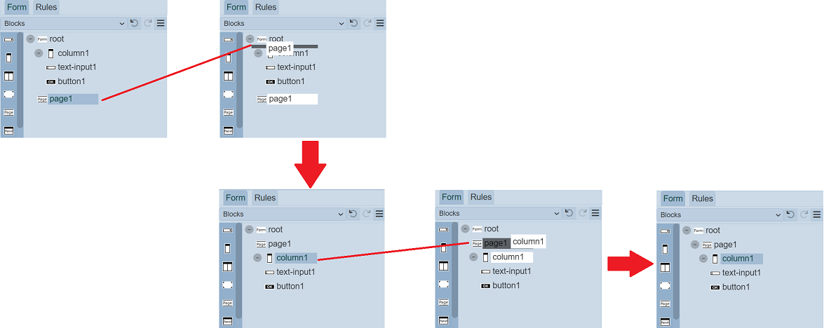 To add a page to the form, select “Blocks” from top row and select the “Page” icon on the left panel in the “Form Structure” section. Drag and drop the “Page” onto “root”. The new page will be added at the bottom of the “root” by default, if there are any components added onto the form prior adding the page. You can relocate the new page by drag and drop it to a new location in the form structure.