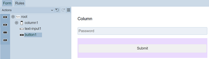 In the simple example below, a new form is created, which includes a input text field and a submit button. First, under the “Blocks” option, select “Column” and drag it to the “root”. Next, under the “Inputs” option, select “Text Input” and drag it to the column. Lastly, add a “Button Bar” under the “Actions” option to the column.