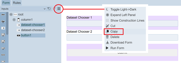 Components Dataset Chooser 1 and Button Bar need to be duplicated in the form. You can click on the Ctrl key and select the Dataset Chooser and Button Bar. Then click on the “More Actions” icon in the Top Row and select the “Copy” option.