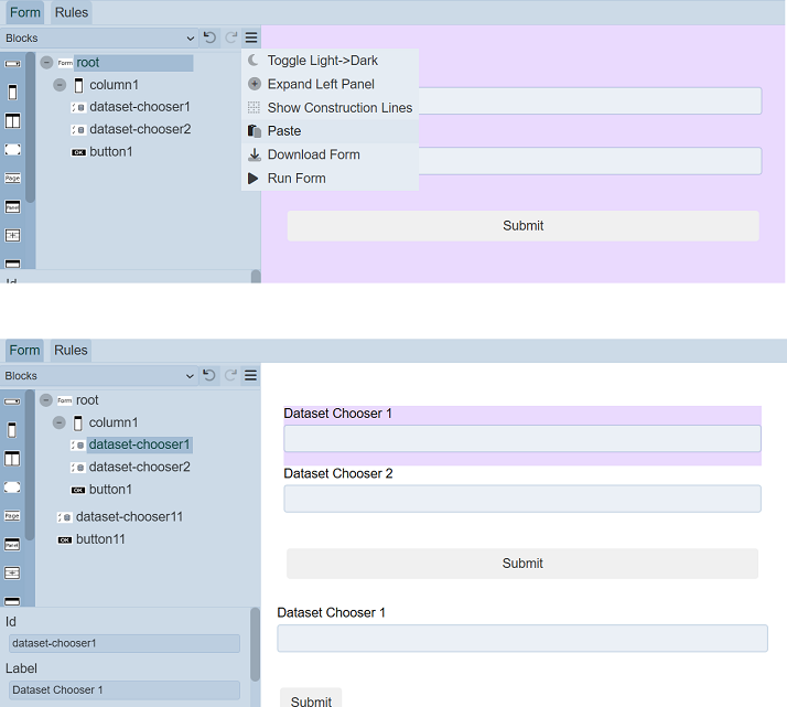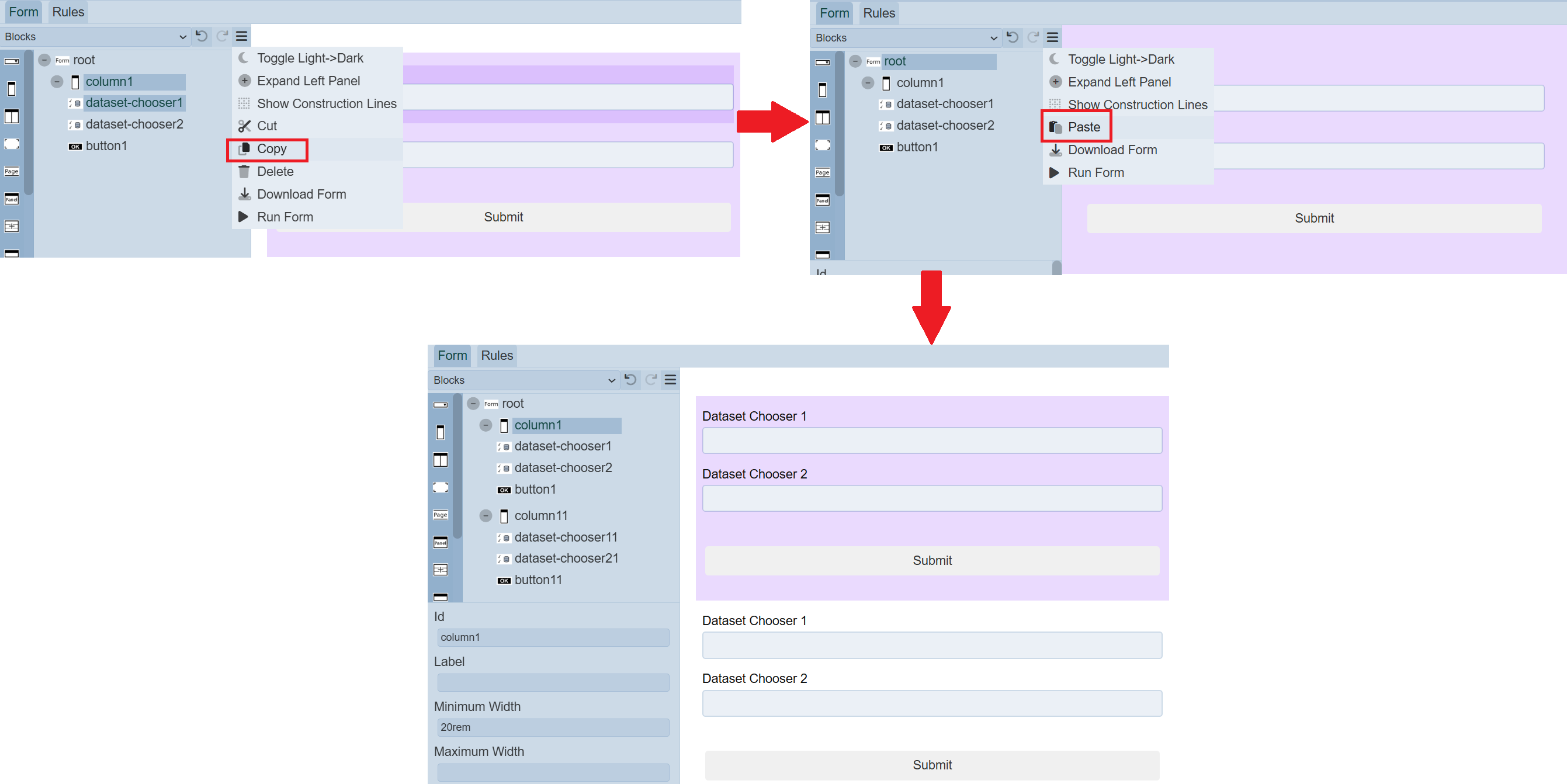 If the parent component (column1) and the child component (dataset-chooser1) are selected and copied. The Paste action will add all the child components along with the parent component. For example, when copying column1 and dataset-chooser1, and pasted to root. The result will be column11 being pasted under root with all its children.