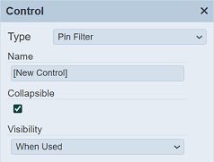 | Type | Selects the type of filter control. | Y | Drop-down list | Select from drop-down list | “Pin Filter” |