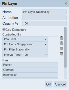 In the Filter Control Panel, there are two filter controls. The “Pin Filter Nationality” filter control is created using the “Pin Filter” control and using the “Pin Icon” filter controls as options to filter the pins on the map. The “Interval 10s” filter control refreshes the map every ten seconds. The interval timer filter control does not have any selection.