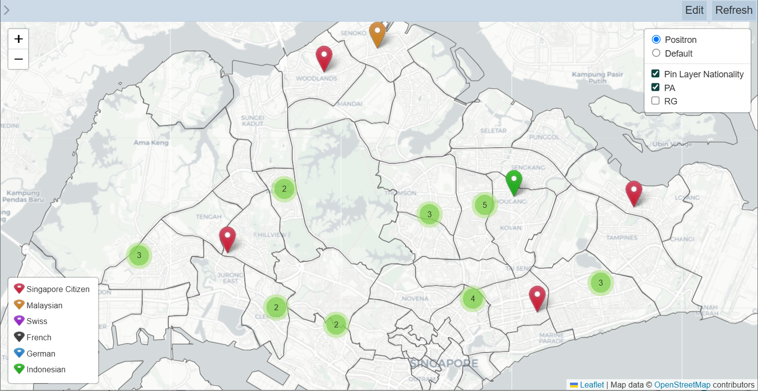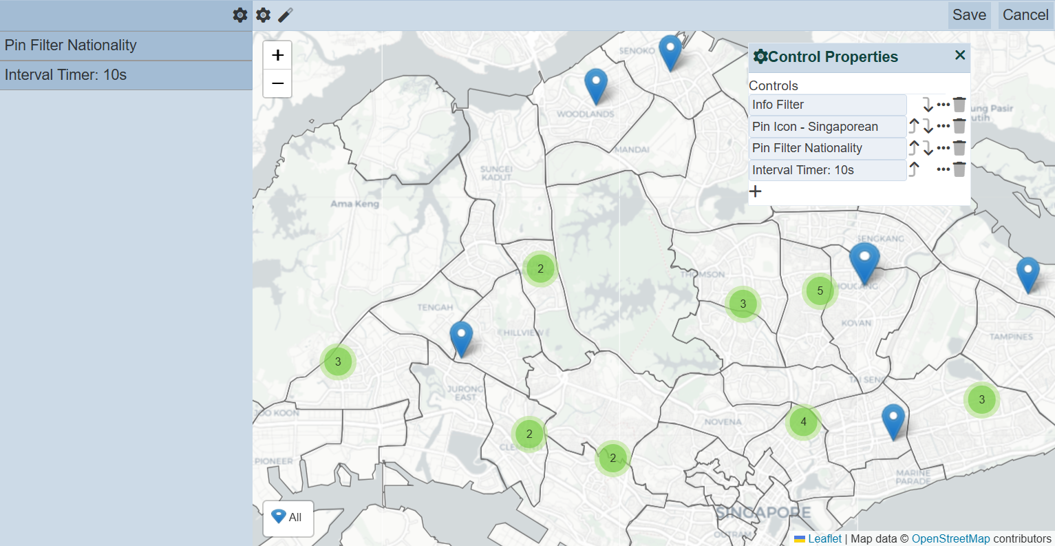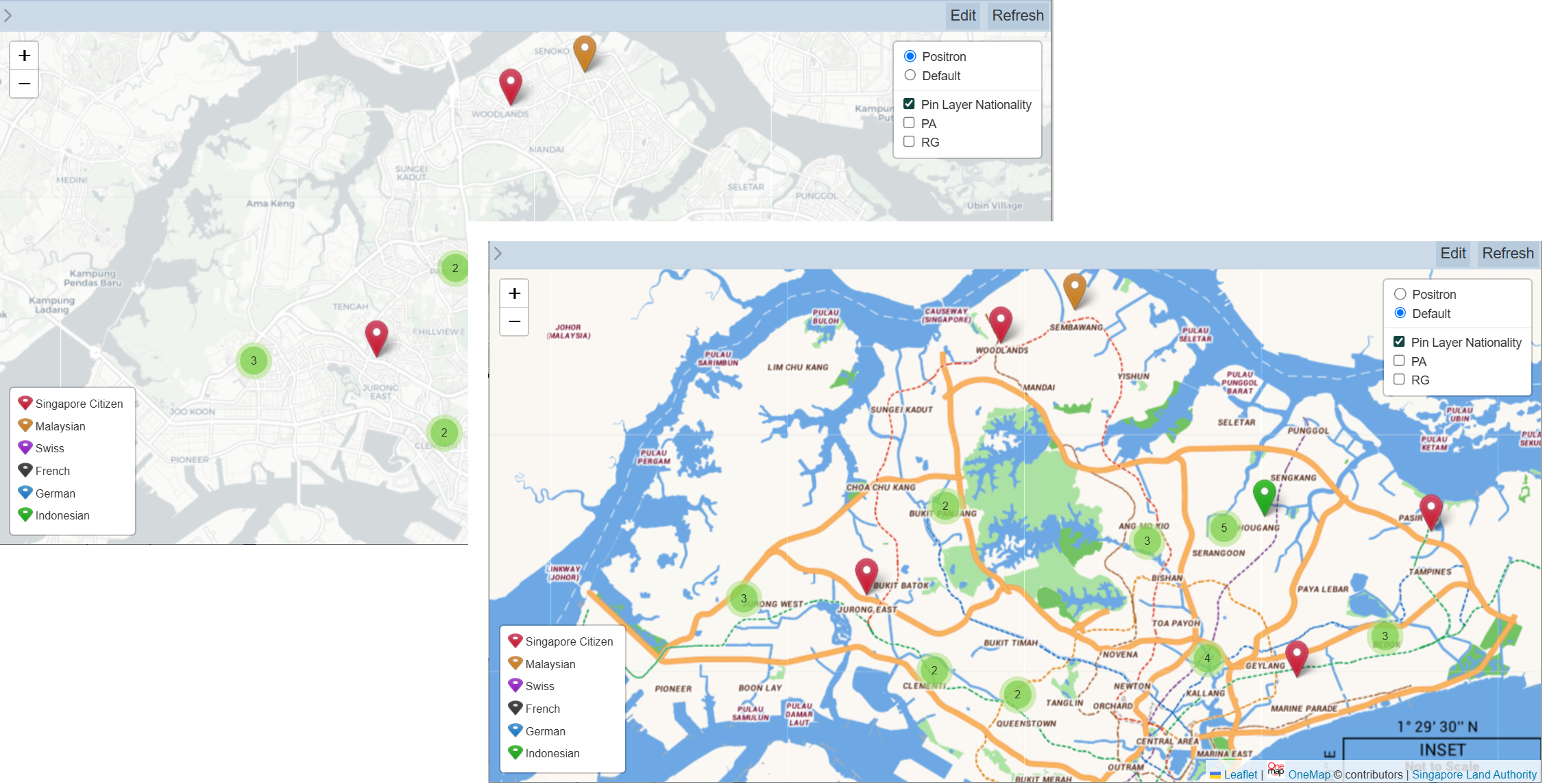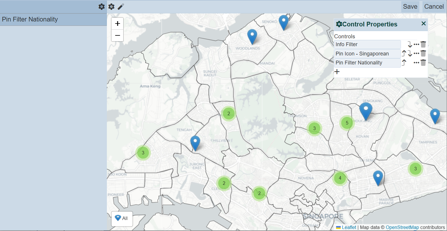 Do note that in the example above, only pin icon created is for Singapore Citizen. Therefore, all other pins will be lumped into the “Others” pin icon. To separate the other nationalities, create one “Pin Icon” filter control for each nationalities with a different colour. Add them to the pin layer to allow the Pin Filter to filter the pin icons.