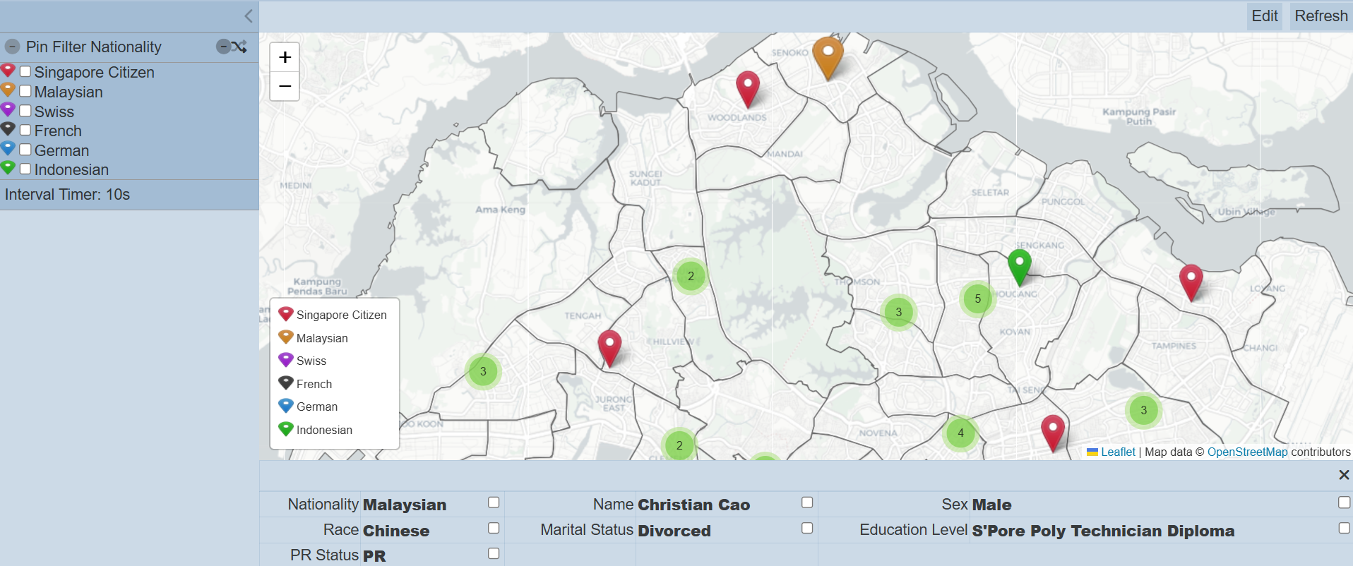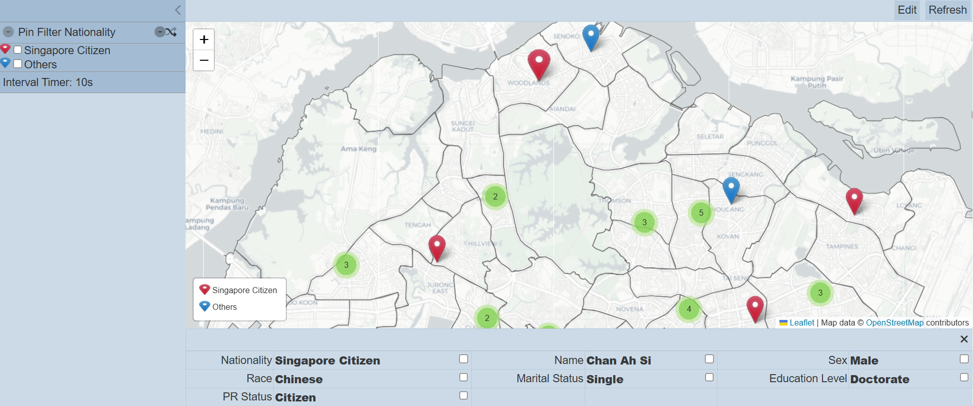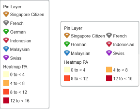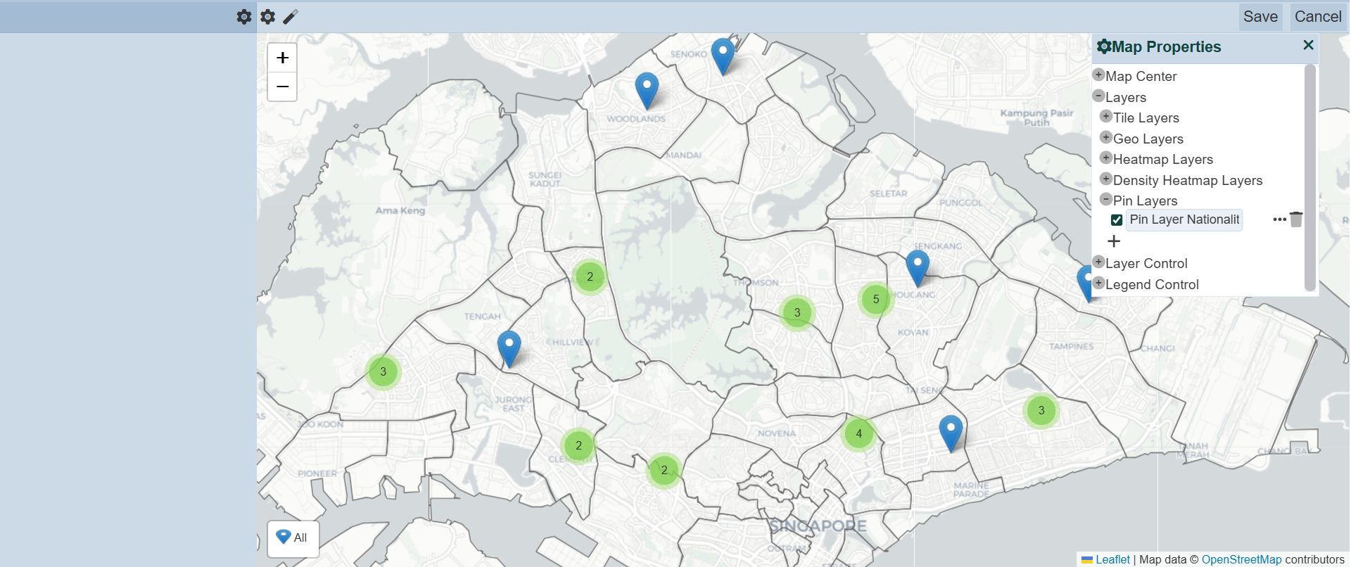 Do note that in the example above, only pin icon created is for Singapore Citizen. Therefore, all other pins will be lumped into the “Others” pin icon. To separate the other nationalities, create one “Pin Icon” filter control for each nationalities with a different colour. Add them to the pin layer to allow the Pin Filter to filter the pin icons.