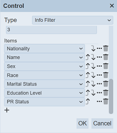 To add a filter control, click on the “+” icon. Select the desired filter control from the drop-down list. Repeat until all desired filter controls are added.