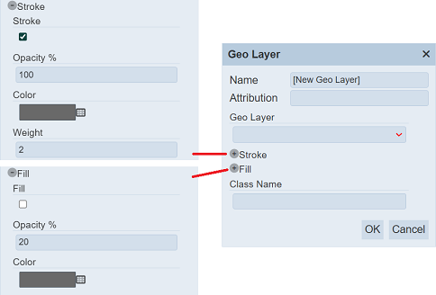 | Stroke | If selected, adds a geo layer outline onto the map with the defined properties. | Checkbox | Enable or disable | Selected |