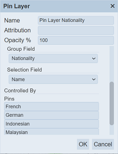 Click on the “OK” button to save the settings. Upon saving the settings, the pins will appear in the map. If the pin layer is disabled (that is, checkbox on the right of “Pin Layer Nationality” is unselected), the pins will not be displayed.