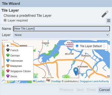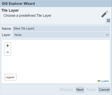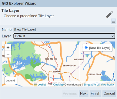 The first step in the wizard requires you to select a tile layer and give it a name. In the “Name” field, key in a unique name for the tile layer. Select the desired tile layer from the drop-down list from the “layer” field. The selected tile layer will appear in the GIS view in the dialog box.