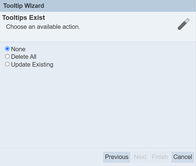 In the next screen, select the desired option. By default, “None” is selected, which means no action is taken. Thus only “Previous” and “Cancel” buttons are available. Select “Delete All” will remove all tooltip previously created. Select “Update Existing” allows you to update existing tooltip. The “Next” button will appear if either one of these two options is selected.