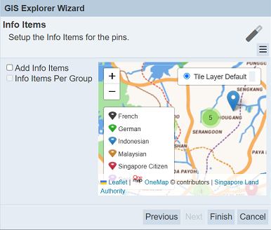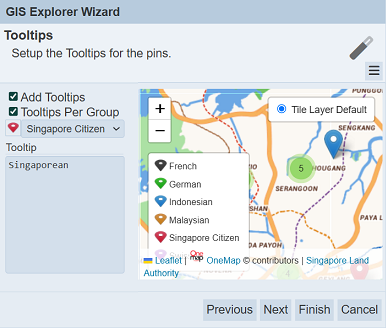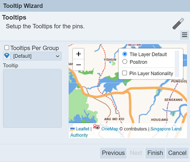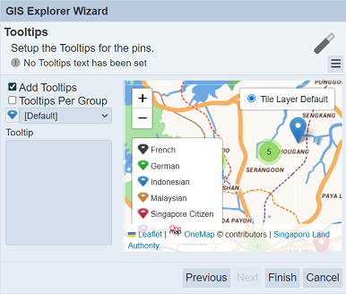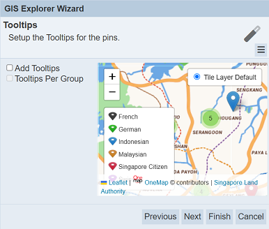 In this mode, a generalised tooltip can be created for the pin icons. Which means all pin icons will use the text keyed into the “Tooltip” textbox. To customise a tooltip for each group, select the “Tooltips Per Group” field. This will allow a different tooltip text for each group. To do so, select a group from the drop-down list and key in the desired text in the “Tooltip” textbox.