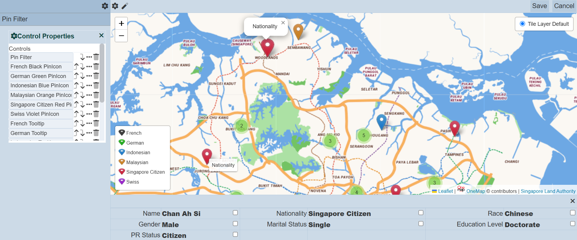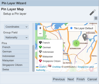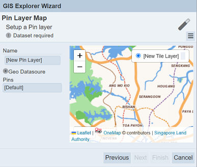 Key in an unique name for the pin layer and select the desired geo datasource. After the geo datasource fields are selected, the “Pins” field and the pins on the GIS view will be displayed automatically.