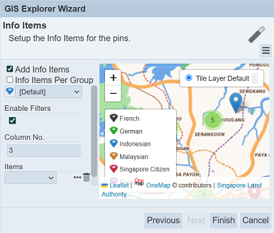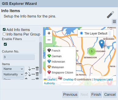 The “Enable Filters” field is selected enables using the info items to filter the pin icons. It is enabled by default.